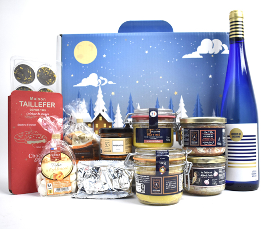 Un écrin de saveurs festives où le foie gras de canard se décline en recettes raffinées, accompagné de terrines gourmandes, d’un moelleux des Côtes de Gascogne et de créations sucrées originales. Un coffret généreux qui allie tradition, raffinement et plaisir à partager.